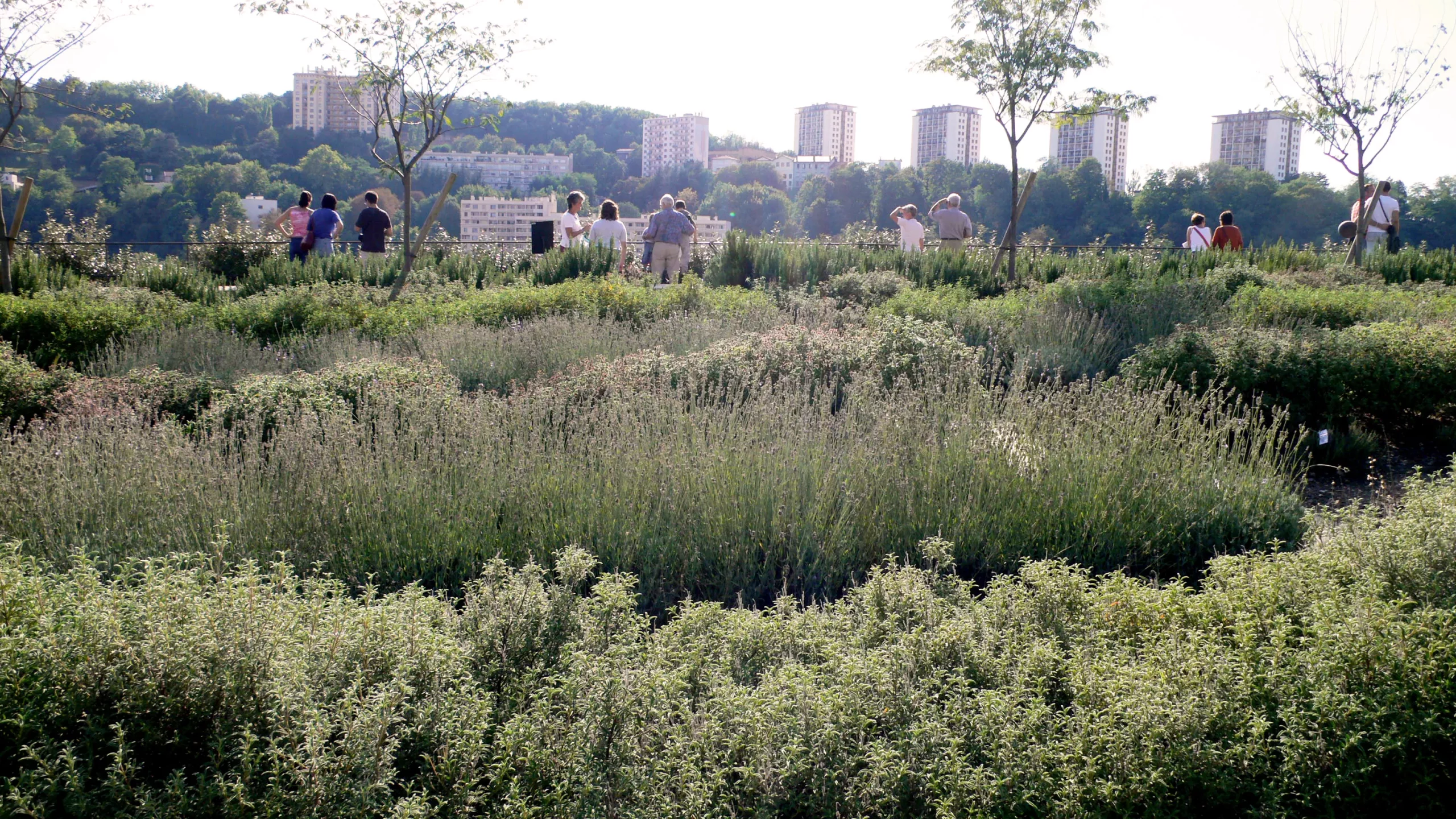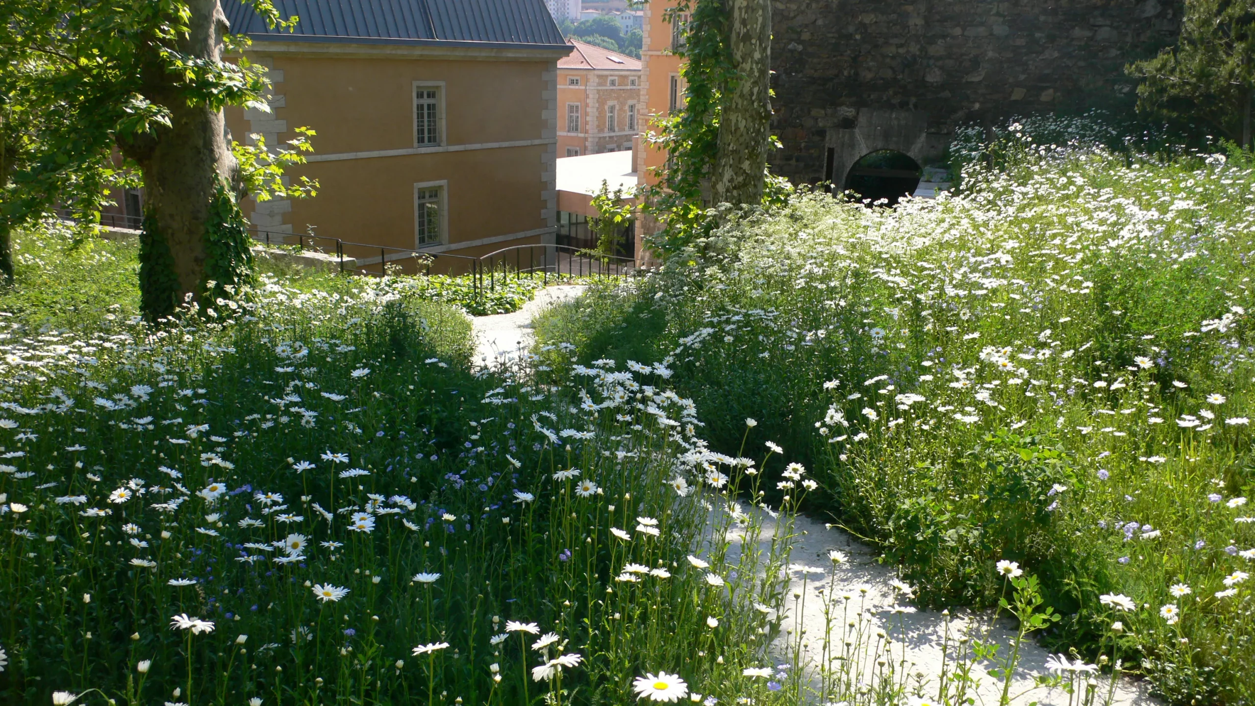 Au centre du fort, la Place d’Armes pavée de calcaire clair affirme son statut de cour ouverte. En balcon sur la ville, le Jardin Méditerranéen ouvre la cour sur les lointains, en cadrant les vues entre une strate basse d’arbustes persistants à fleurs et de vivaces parfumées de type méditerranéen. Fil « conducteur » du parcours, le chemin de ronde permet de découvrir des vues sur l’horizon ou, plus proches, des regards plongeants sur les différents lieux de l’École. Dans chacun de ces espaces, la relation singulière avec le site et l’exposition permettent de décliner des ambiances végétales diverses : vis-à-vis vigoureux entre bâtiments et remparts pour la cour de service ; ambiance de sous-bois sous les frondaisons des platanes existants pour le jardin du bastion ; pins et arbres de Judée de la Redoute ; grand monochrome des sedums pour l’amphithéâtre ; cépées de savonniers ombrageant le tapis de graminées des jardins terrasses de la bibliothèque ; surplomb de la haute treille-passerelle où s’accroche une glycine ; prairie fleurie rustique, figuiers et roses trémières pour les terrasses basses largement soumises au vent et au soleil.