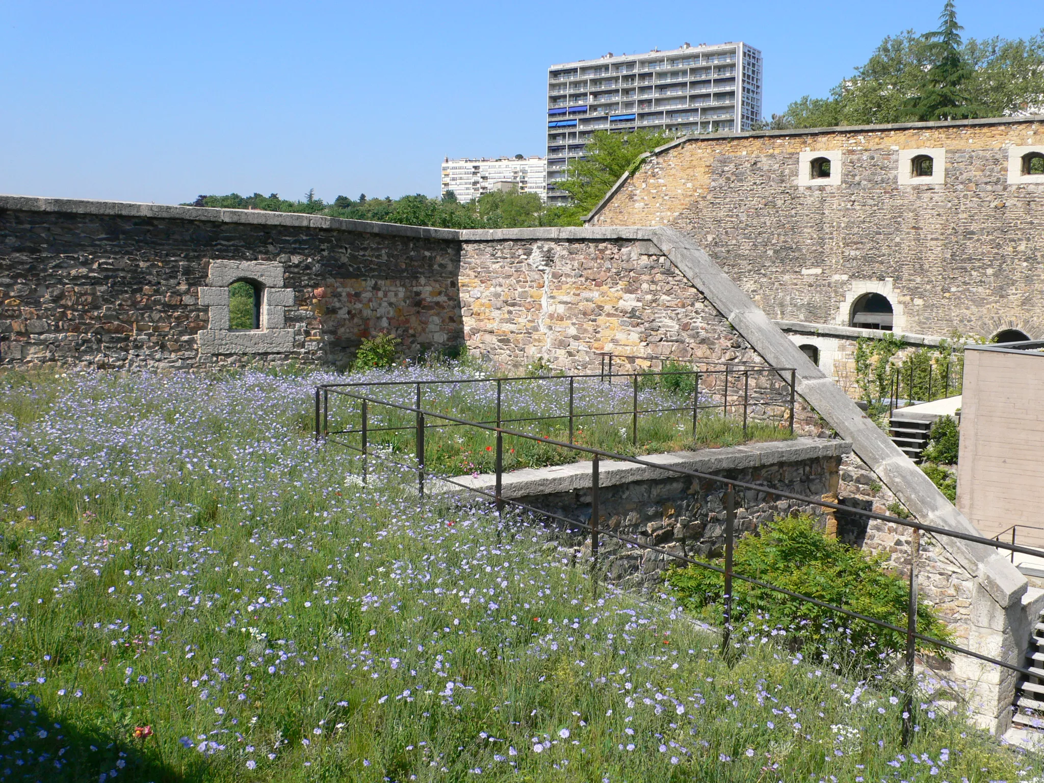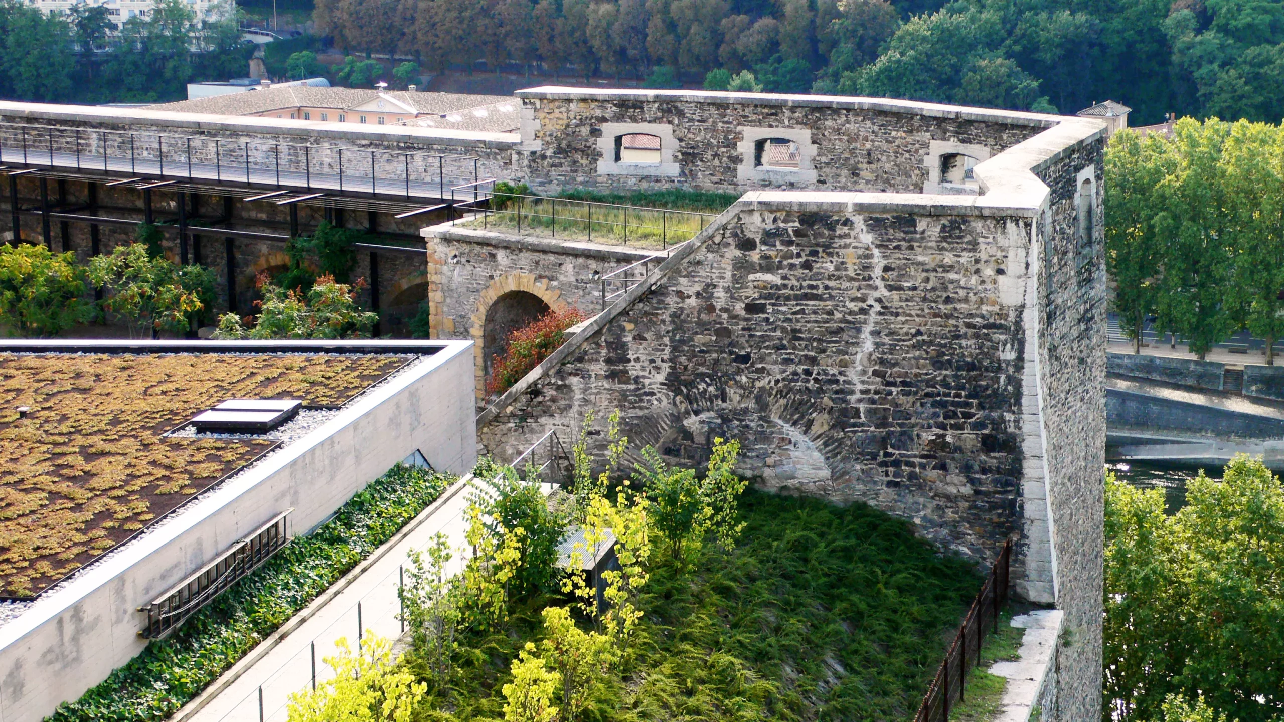 À Lyon, le fort St-Jean surmonte un éperon rocheux, en rive gauche du défilé de la Saône. L’aménagement, qui permet d’accueillir la nouvelle école nationale des contrôleurs du Trésor Public conforte la très grande qualité du site par des principes très simples : une grande cour minérale fédère l’ensemble des espaces ; des « bâtiments paysages » se glissent dans les fortifications en reprenant le vocabulaire des terrasses, glacis et murs ; un chemin de ronde relie des jardins singuliers, aux ambiances végétales contrastées.