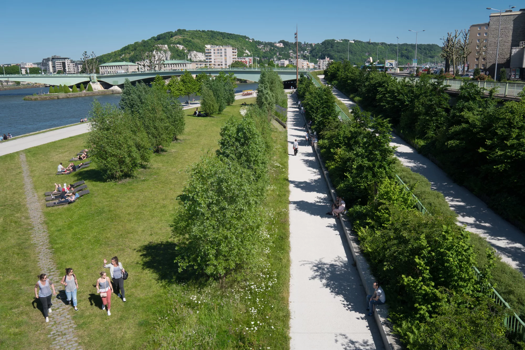 Face à la côte Sainte-Catherine et à la cathédrale, la promenade fluviale s’étire sur un kilomètre ; plantée de cépées de platanes et rythmée par plusieurs ponts formant trois séquences.