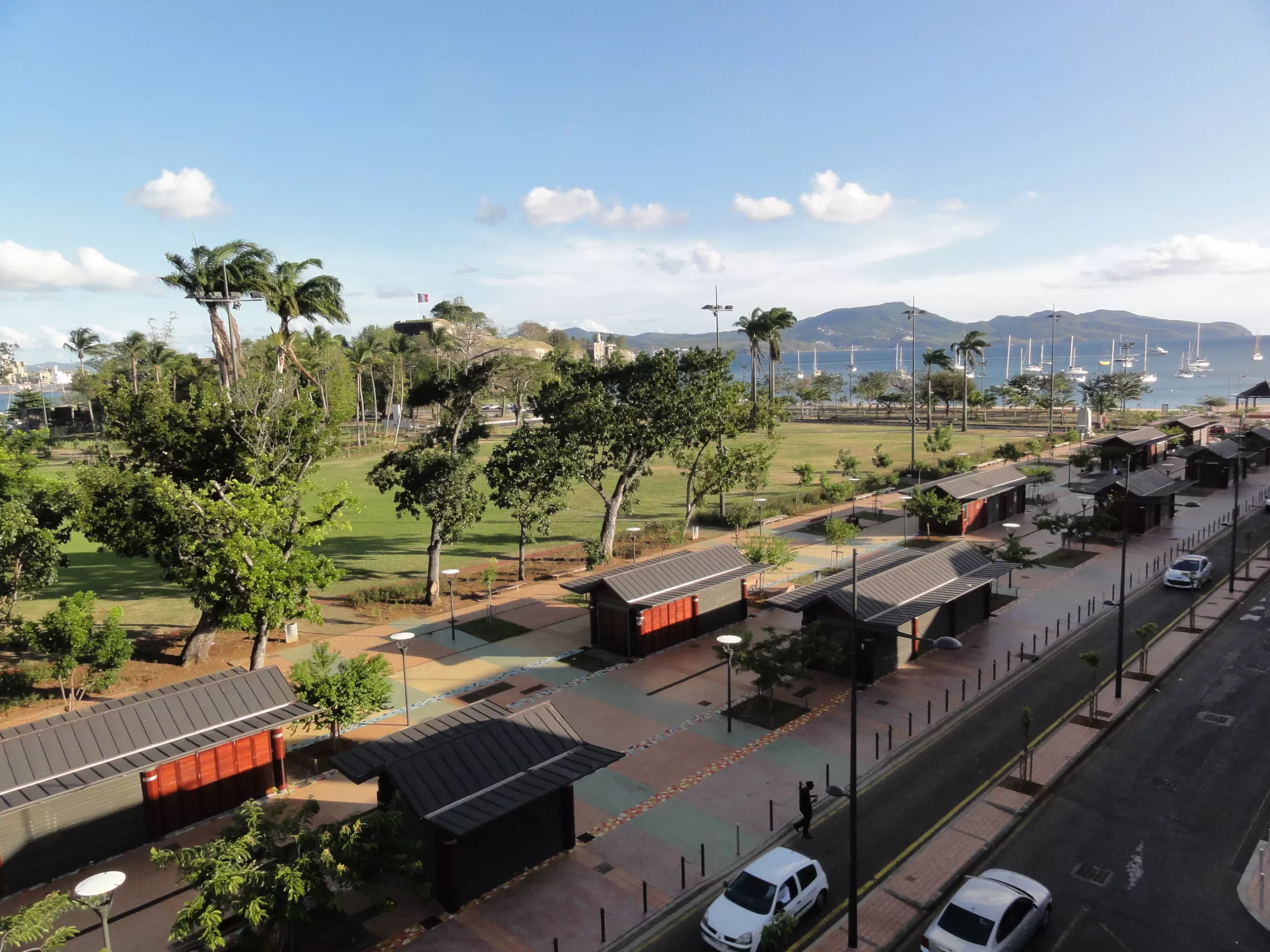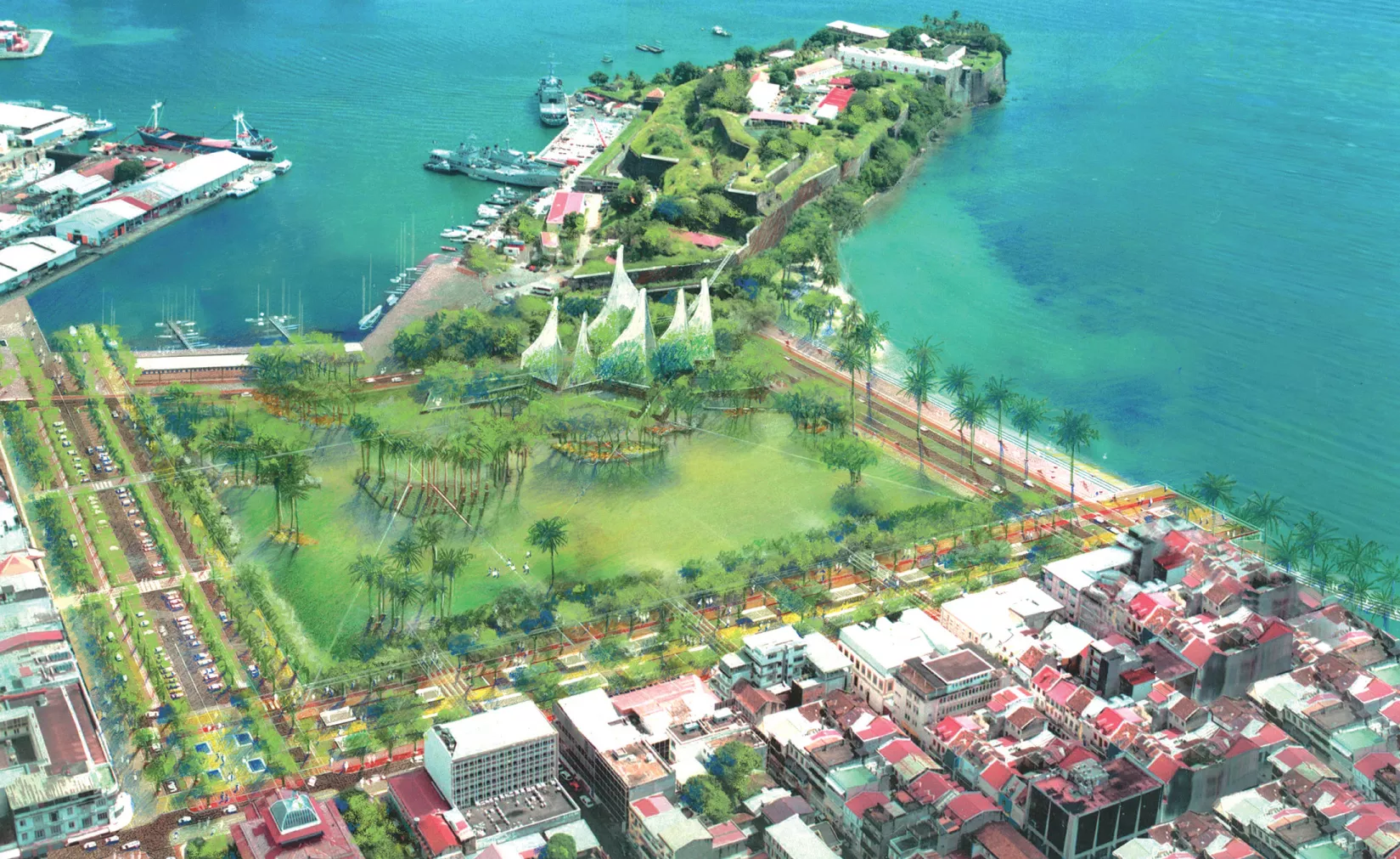 Au cœur de Fort-de-France, « la Savane » constitue un vaste espace à l’identité très marquée. Cet ancien glacis rectangulaire de 8 ha, situé entre la ville coloniale et le Fort Saint-Louis, s’ouvre à la fois sur le port du Carénage et sur la baie des Flamands. Le projet d’aménagement retenu s’organise autour de quelques principes fondamentaux. Rétablir l’ouverture d’une vaste étendue