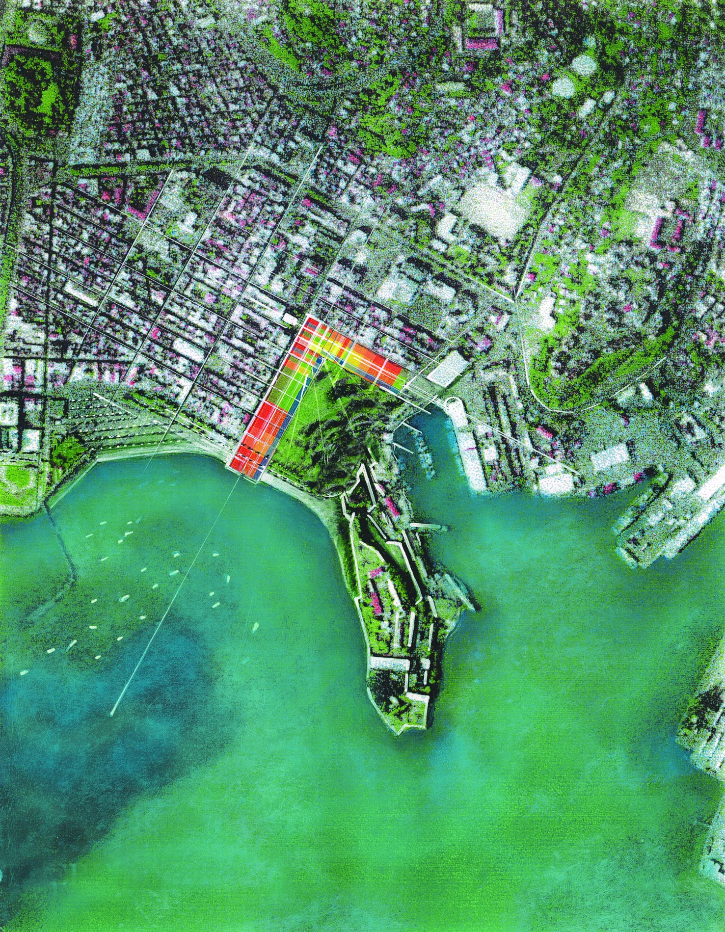 Installer une frange active au contact des deux façades urbaines, intégrer le patrimoine végétal existant, révéler les traces des anciennes fortifications : Le jardin d’eau imaginé dans les vestiges des douves et bastions, dessiner la continuité d’une promenade le long de la baie et régénérer une plage à l’abandon, et rendre aux piétons un espace jusqu’alors confisqué par le trafic et le stationnement. Les tracés du projet prolongent le tissu quadrillé de la ville, la trame colorée des sols composant un madras qui anime les allées des mails.