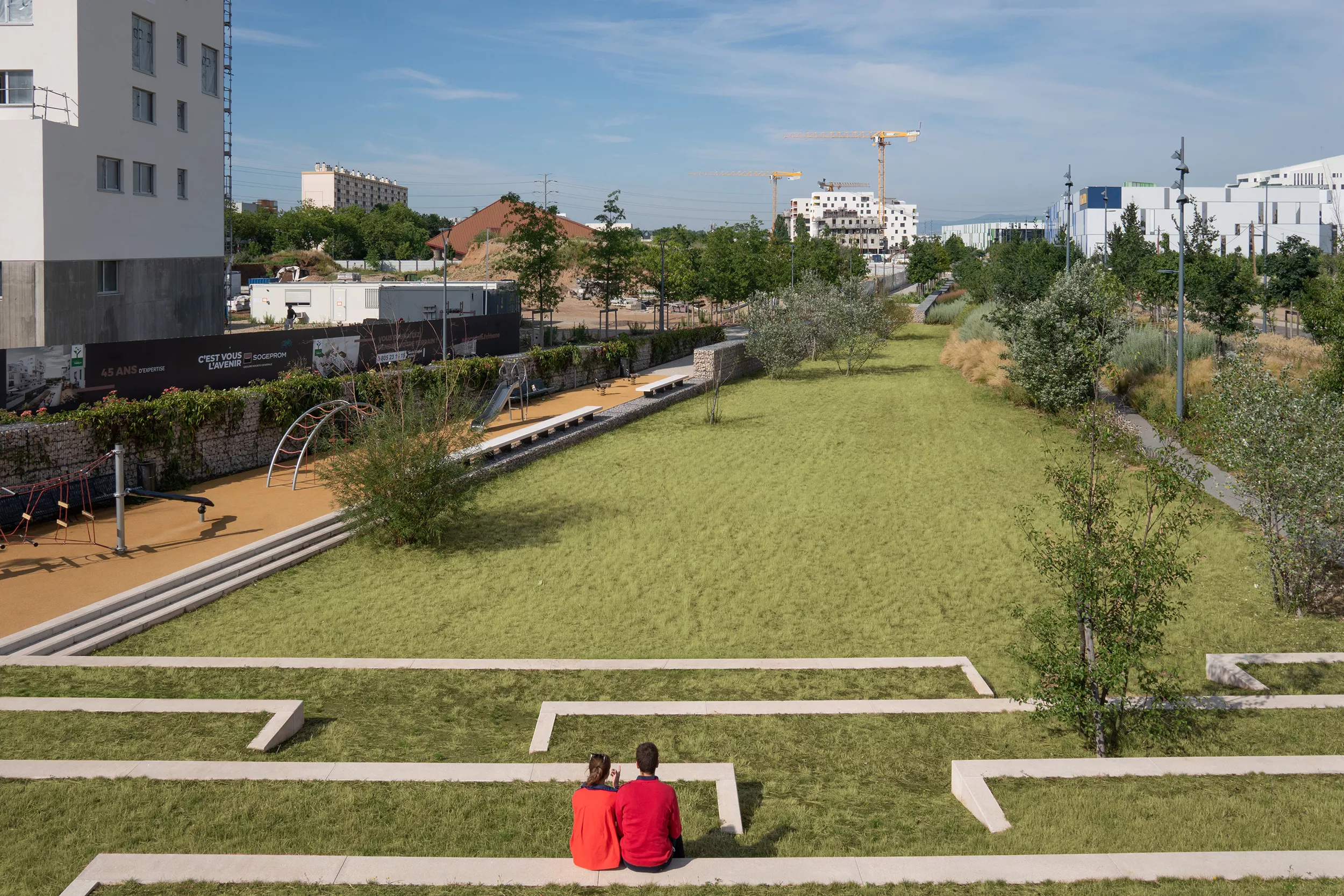 Le quartier est structuré autour d’un espace paysager majeur, le Sillon planté. Cette armature végétale étirée dans la longueur du site affirme l’identité d’un quartier «vert», et donne la part belle aux modes doux et au recueil alternatif des eaux pluviales. Bordée d’un alignement de chênes, une promenade s’étire dans toute la longueur du site, et organise autour d’une noue plantée les parcours piétons et cycles, depuis les stations de tramway et de métro jusqu’au cœur du quartier.