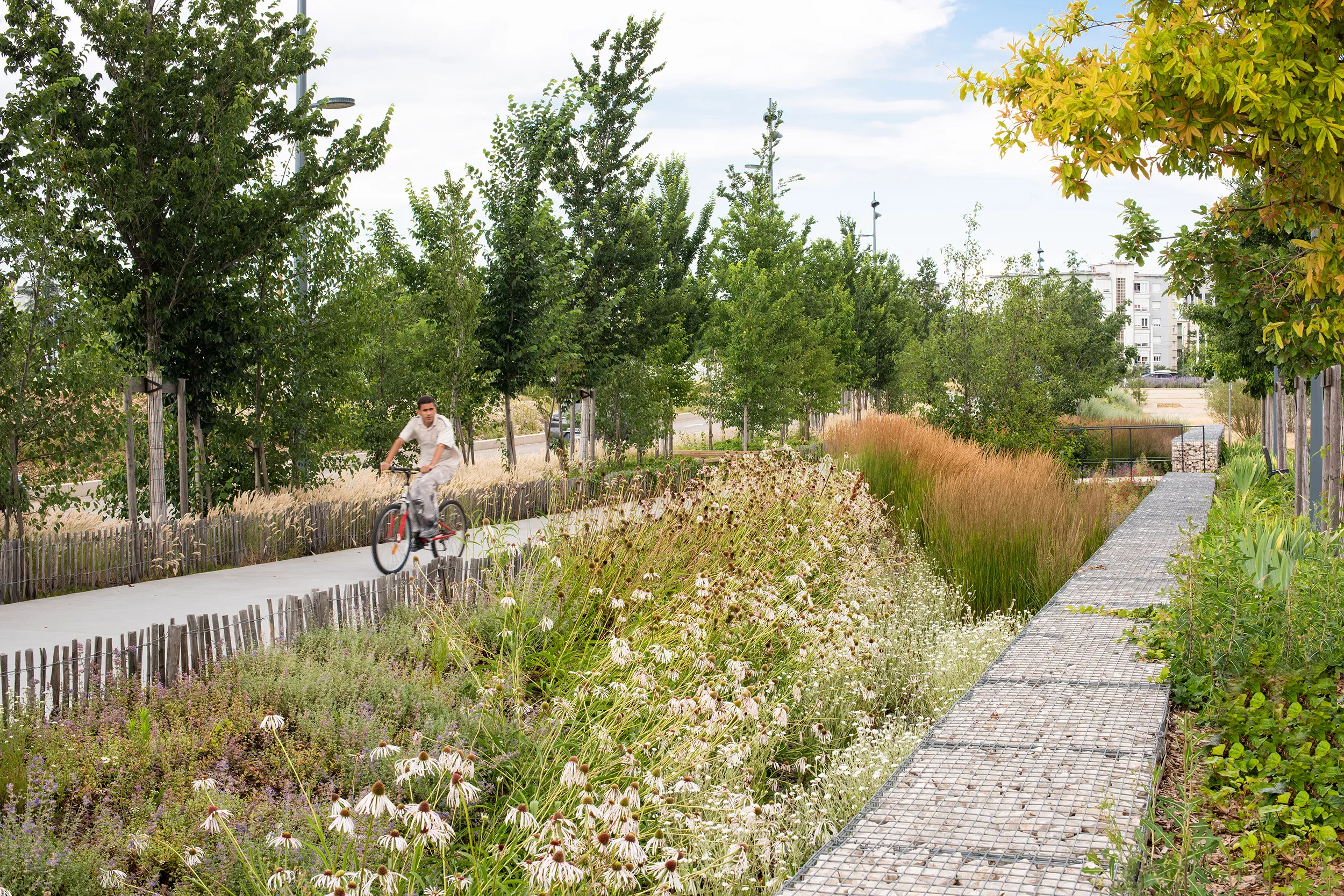 La noue recueille les eaux pluviales des espaces publics et s’épanouit à ses extrémités dans des jardins et prairies inondables, qui permettent de réguler les pluies d’orage. Au cœur du quartier, la place crée la respiration d’un grand vide transversal et installe un vaste espace public, actif et dynamique. La palette végétale, adaptée au sous-sol très drainant du site, s’inspire des milieux de grandes plaines. La grande variété des essences qui la composent, favorise la biodiversité et permet de composer des ambiances très diversifiées.