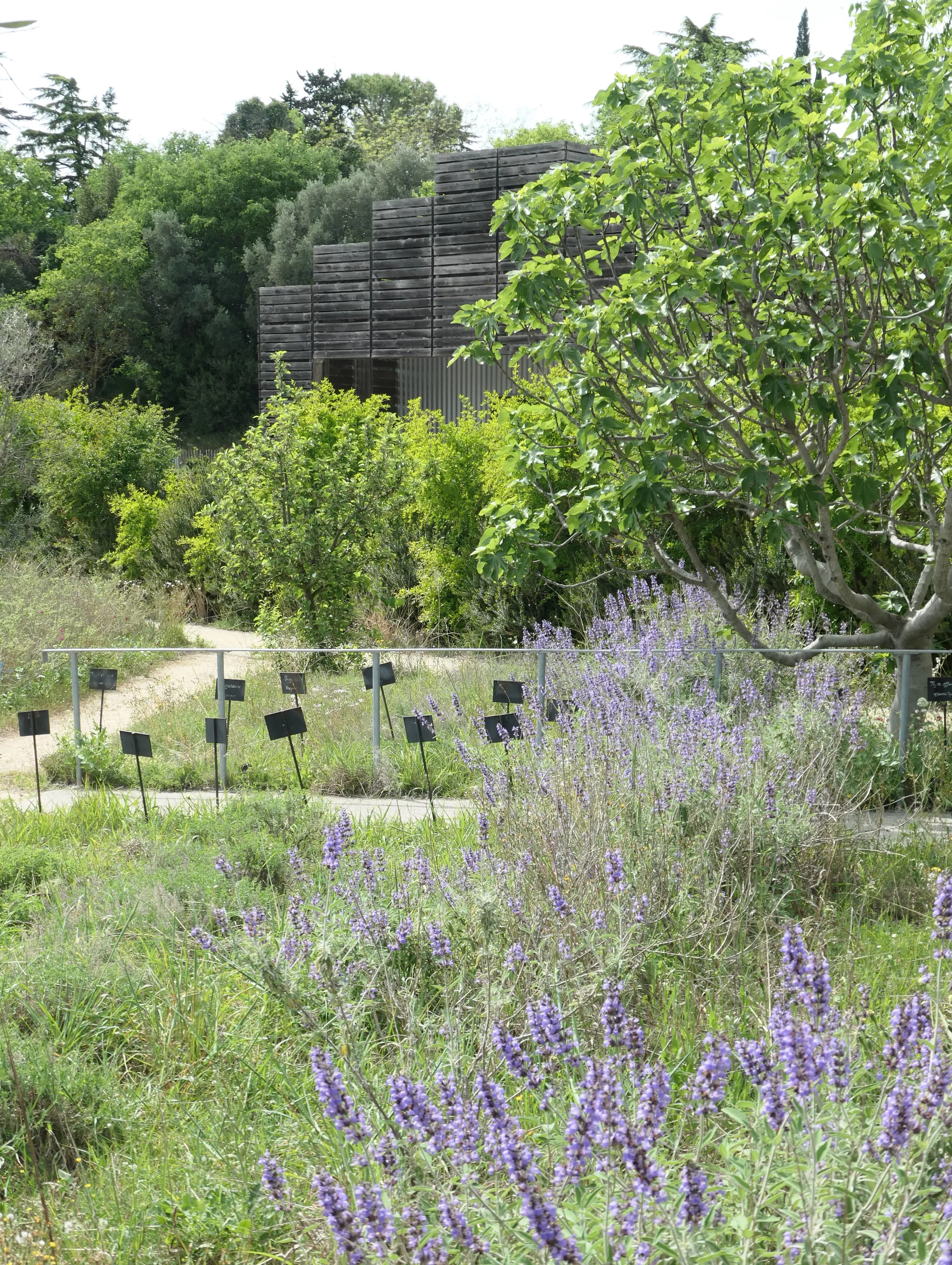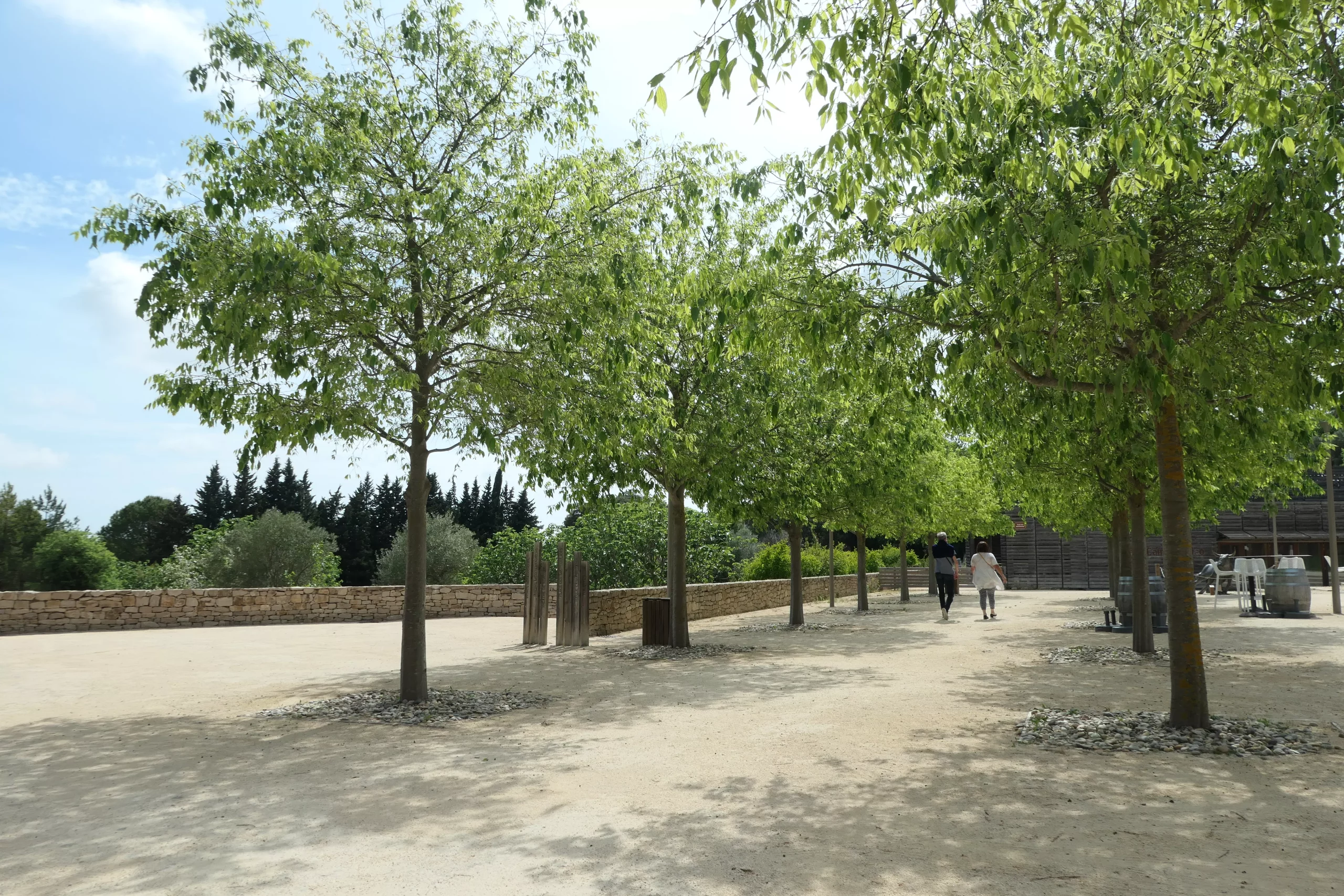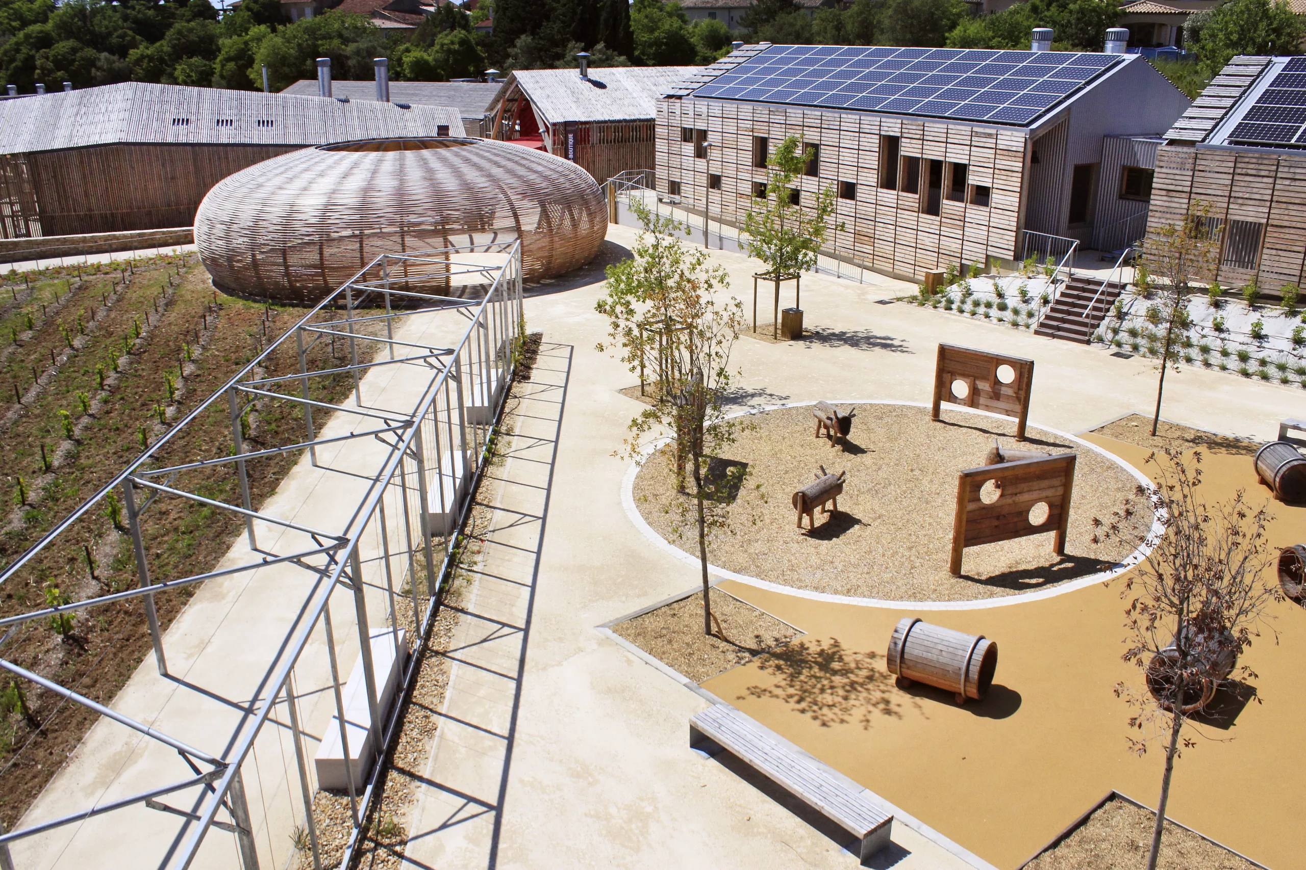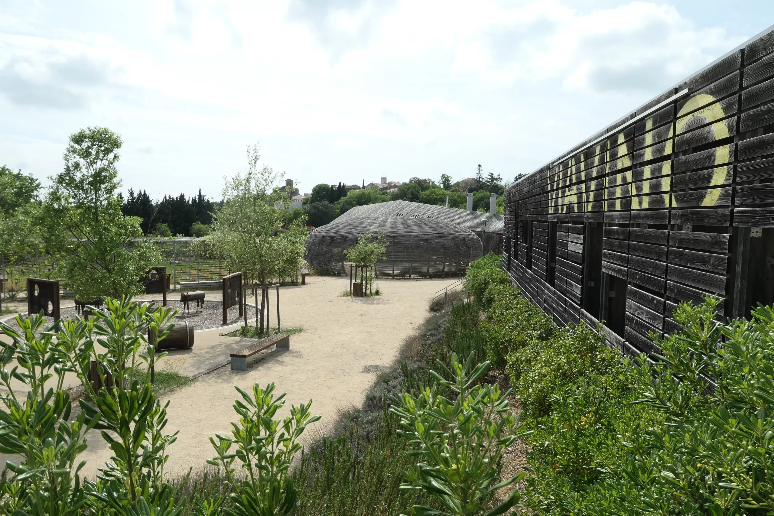 Le visiteur pénètre dans Via Vino par une rampe piétonne qui se glisse dans l’enveloppe bardée du bâtiment d’accueil, et débouche sur la vaste plateforme sablée sur laquelle se succèdent les différentes bâtisses du pôle. La terrasse des jeux, délimitées par une rustique pergola métallique et un volumineux patio à claire-voie, domine le versant occupé par le jardin ampélographique où sont présentés les différents cépages et modes de conduite de la vigne. L’esplanade domine le théâtre de plein air et le jardin des saveurs et senteurs, telle une place de village à l’ombre de micocouliers, elle accueille événements et festivités. En contrebas, les terrasses enherbées, aux murets de pierres sèches, jouxtent plantes aromatiques et fruitiers cultivés en plates-bandes, parcourues d’allées en pente douce.