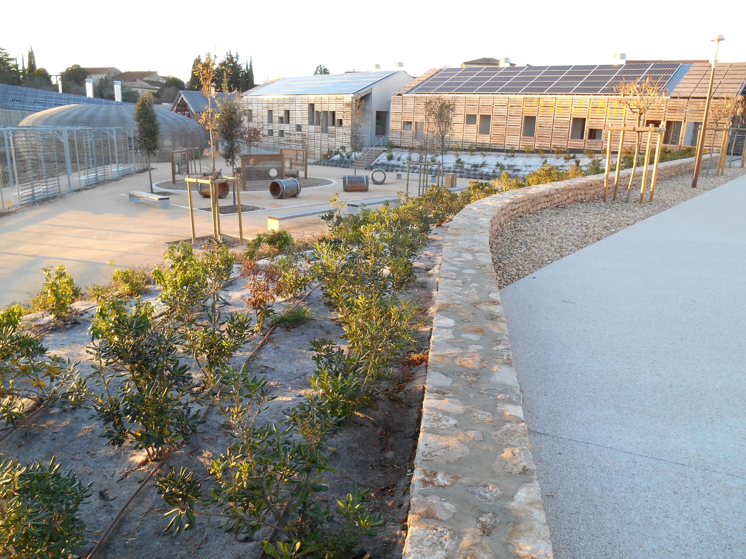 Le paysage est installé au plus près du terrain, mariant nature et culture. Le projet s’est inscrit dans la logique d’urbanisation villageoise plutôt que dans une démarche purement architecturale. Placés en partie haute du site, les bâtiments confortent la situation actuelle : un ensemble bâti dense cerné par le terroir agro-viticole. Avec des matériaux et des essences locales, le projet de paysage prolonge le grand paysage environnant.