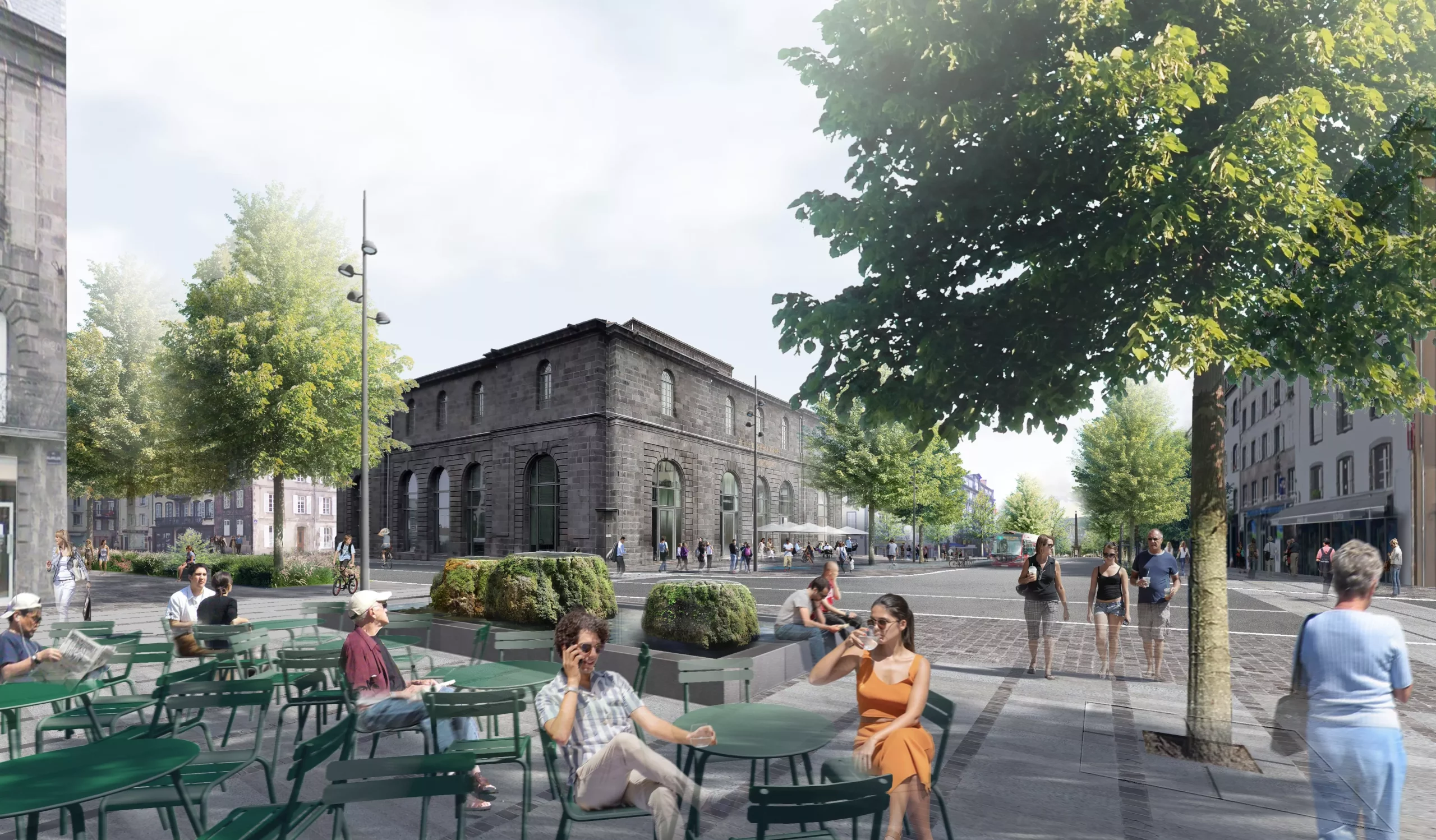 Les allées du Cardo deviennent un éloge de l'eau, des arbres et de la pierre de lave, identité de Clermont-Ferrand.