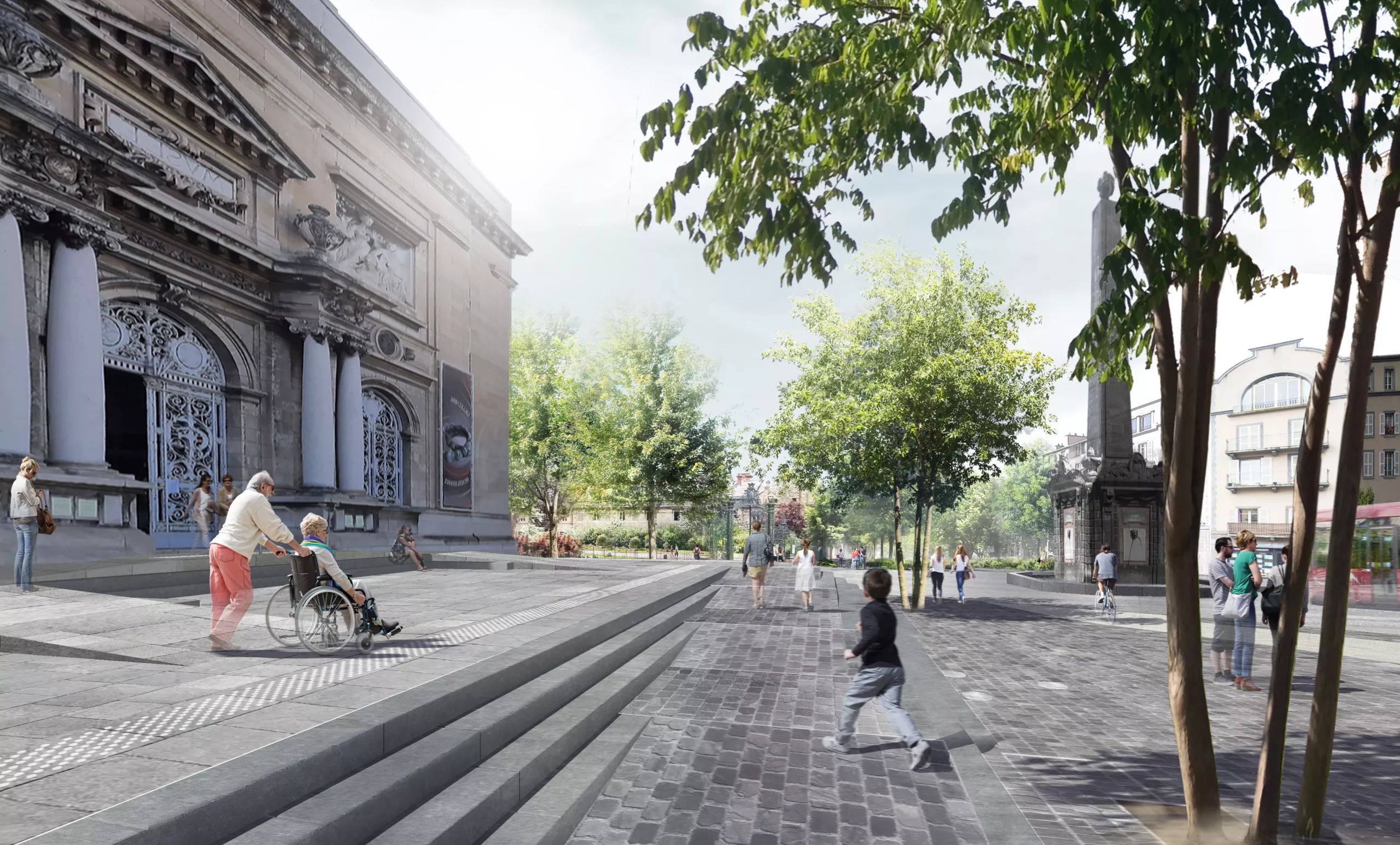 Le projet simple et fluide fait la part belle aux mobilités douces et aux déambulations : des allées pour les bus et les cycles et de larges et confortables trottoirs pour les piétons. La ligne est son élément d’identité, elle se déploie en un faisceau de lignes parallèles ponctuées d’accidents : les lignes s’interrompent, se transforment en alcôves, un arbre majestueux sort du rang, etc.