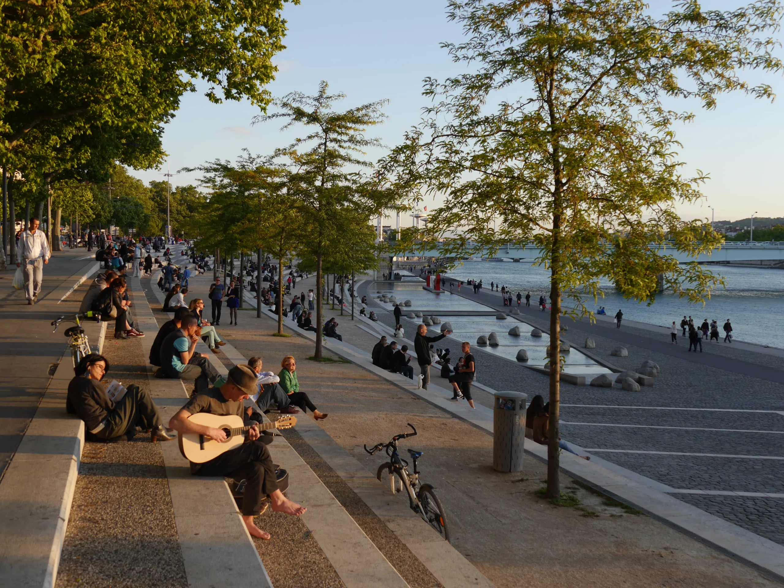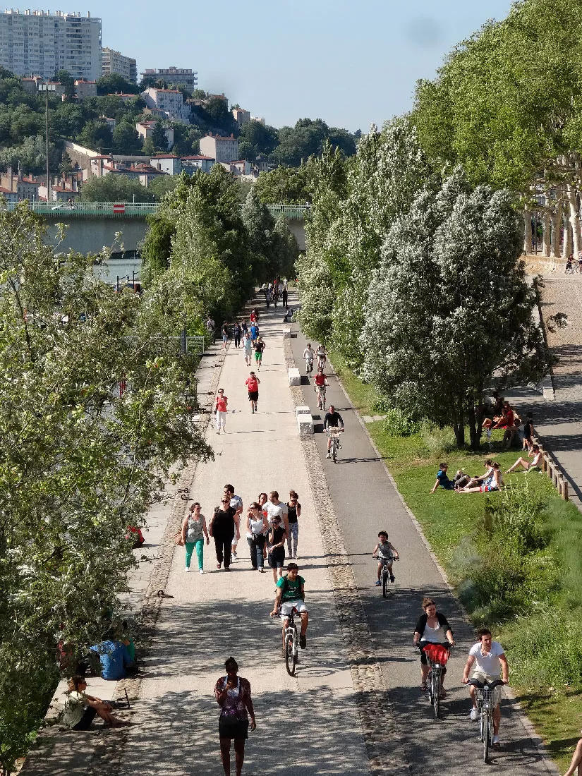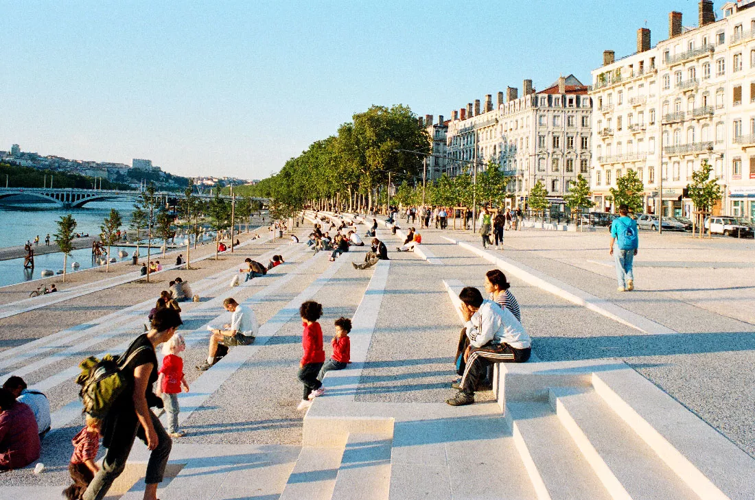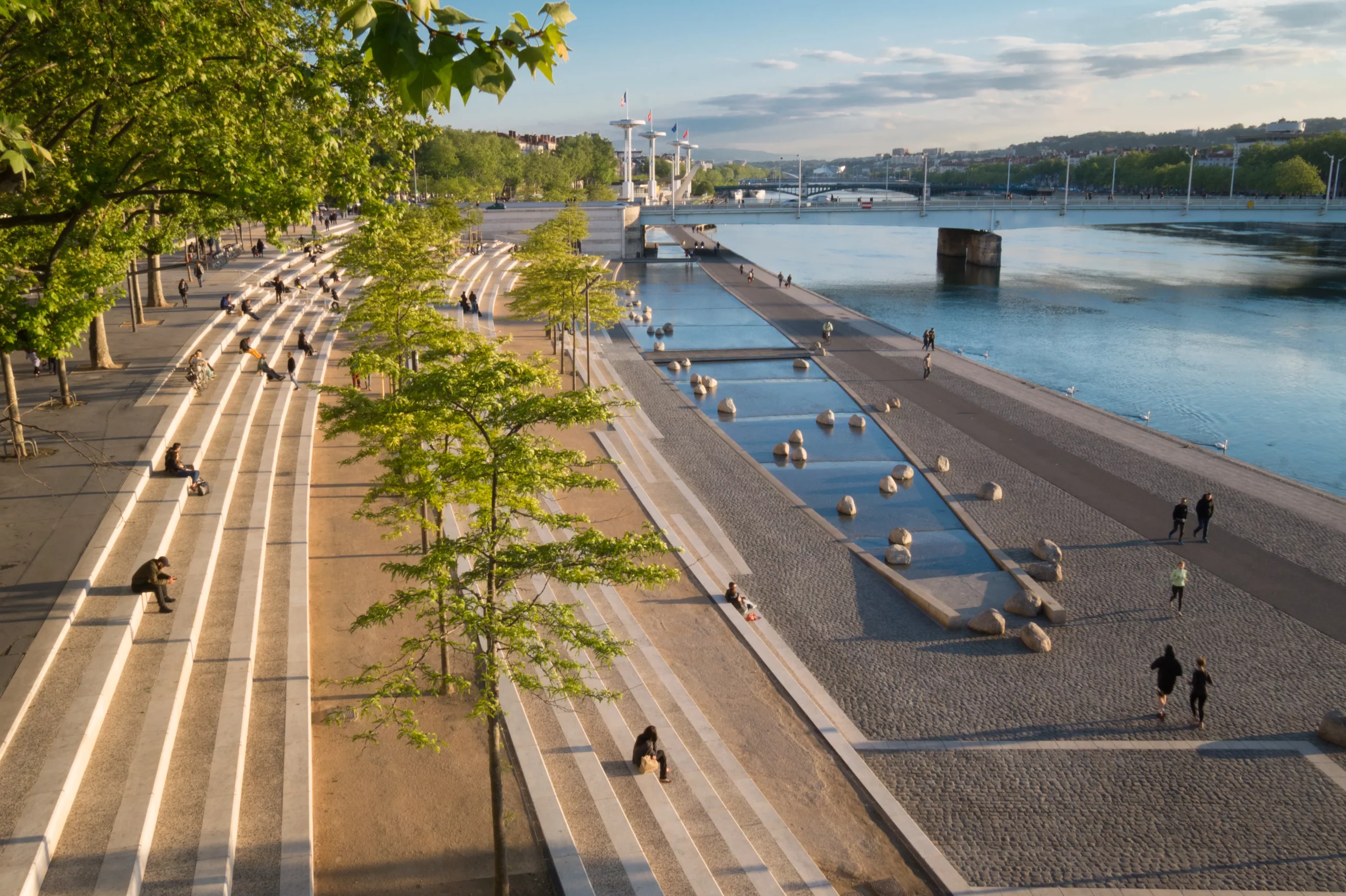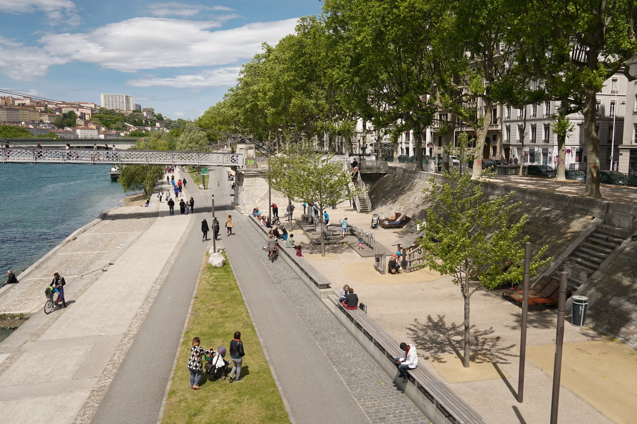 Cinq kilomètres de berges, 10 hectares au cœur de Lyon, un terrain de jeu unique, ouvert sur le Rhône et l'horizon. Suite au marché de définition, la concertation a permis d'ajuster le projet et de favoriser son appropriation la plus large. Les contraintes des crues ont permis d'éviter une spécialisation excessive des lieux pour proposer un enchaînement d'espaces publics ouverts, sans cloisonnement. Nous avons travaillé sur la fluidité, la manière dont on glisse d'une séquence à l'autre dans une sorte de travelling pour créer un espace linéaire, fertile, fluide, souple, généreux. C'est désormais un sillon de nature et d'espaces publics, un port auquel sont amarrées de nombreuses péniches, qui est aussi un parc-promenade extrêmement fréquenté et singulièrement vivant.