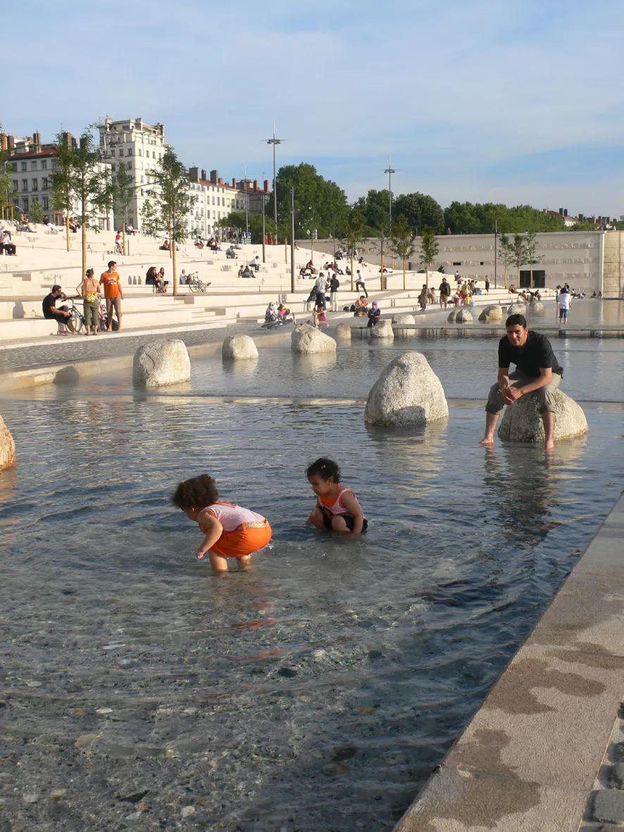 les gradins de la Guillotière s'ouvrent généreusement sur les bas ports et sur l'horizon de l'Hôtel Dieu et la colline de Fourvière, qui se reflètent dans la lame d'eau. Ce vaste amphithéâtre accueille de multiples événements, il est devenu un lieu de rendez-vous ;