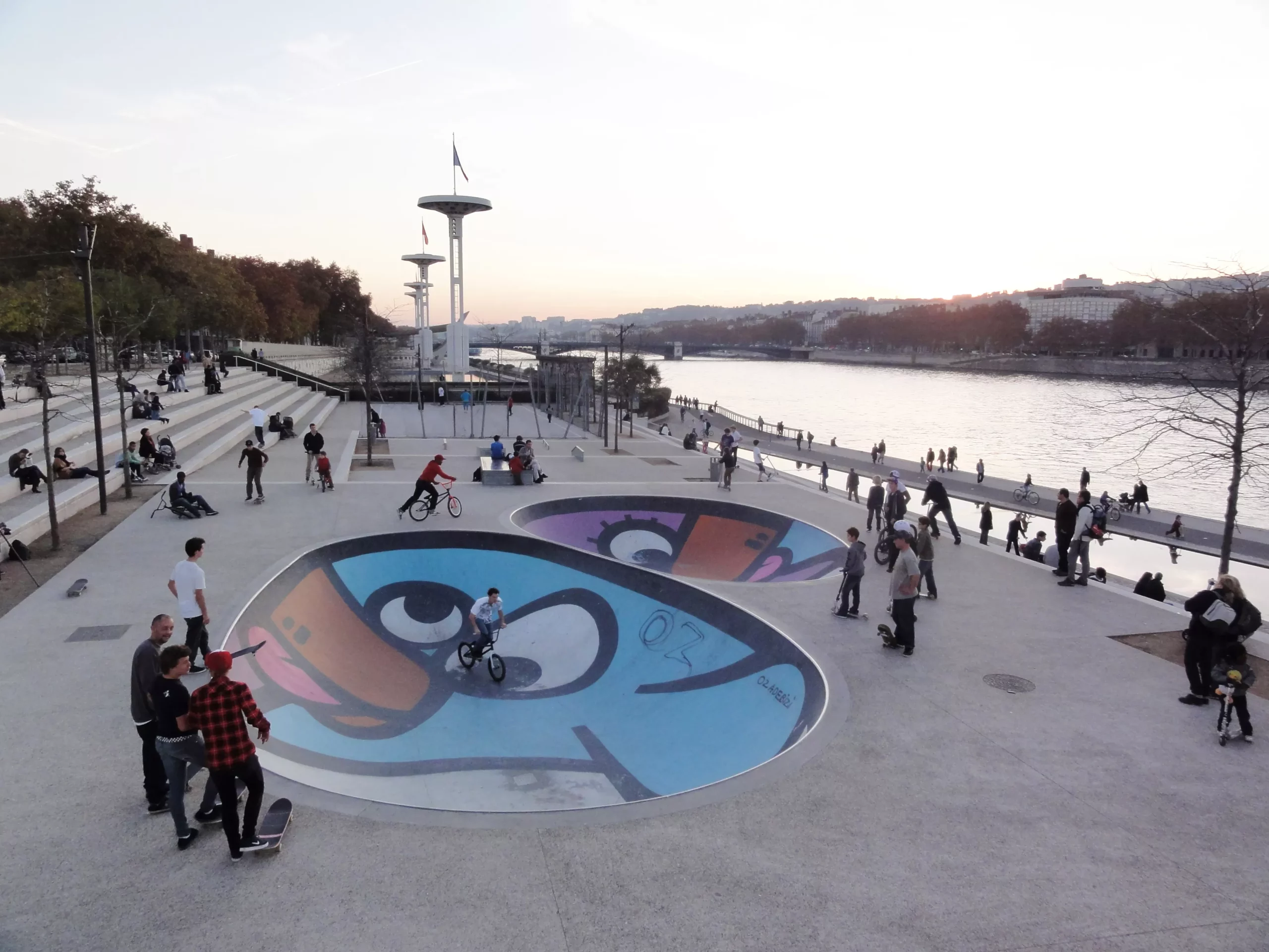 des boules de skate et des terrains de sport agrémentent certaines terrasses, en balcon sur le Rhône à l'aval du Pont de la Guillotière ;