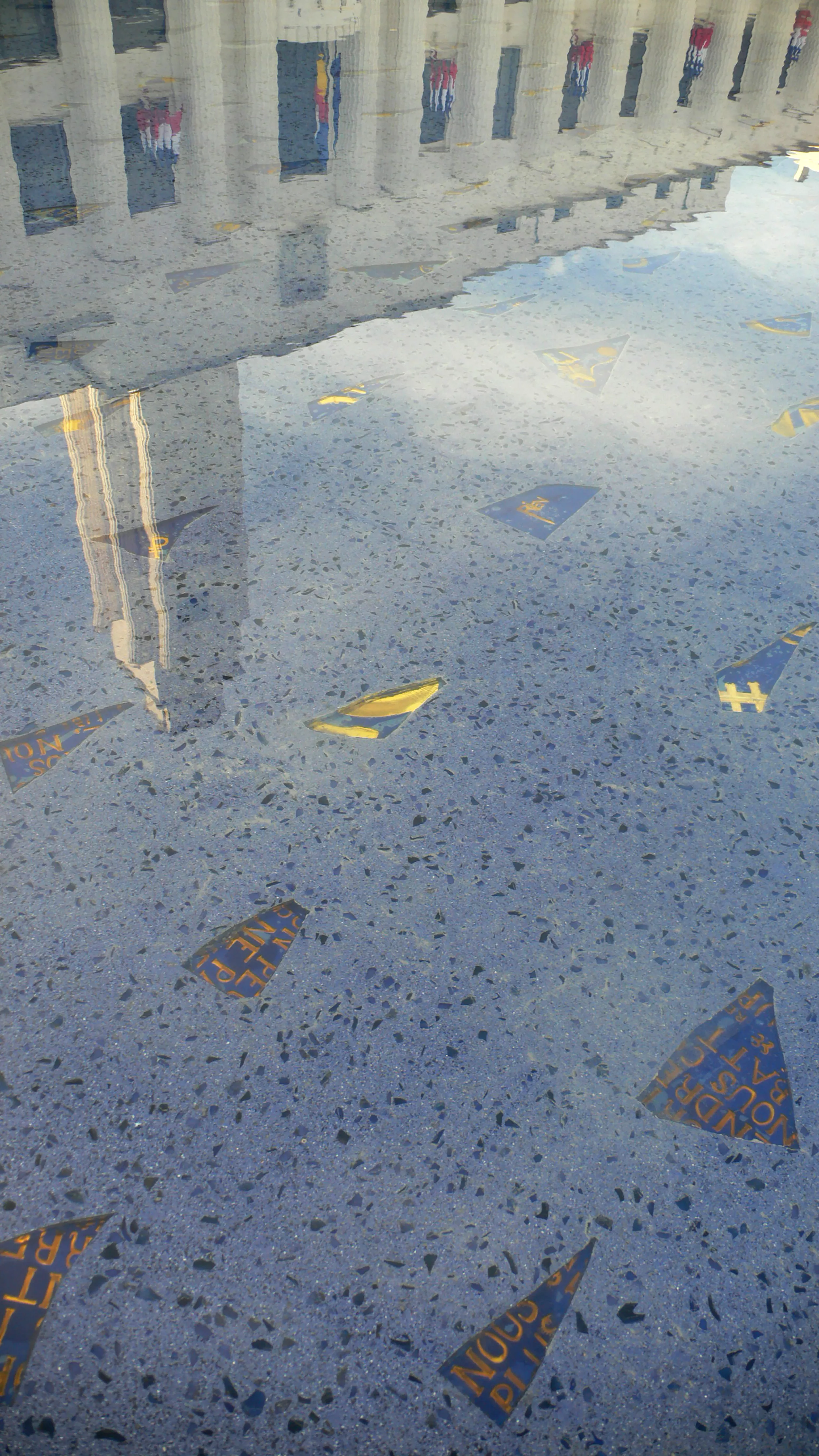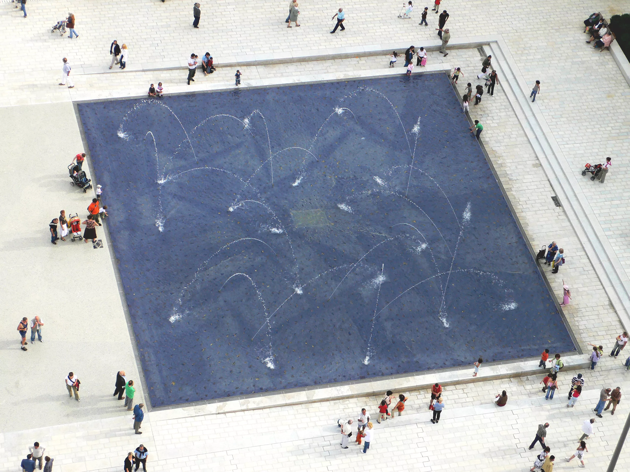 Au centre de la place, les deux bassins miroirs carrés sont sertis dans le sol. Le niveau des plans d’eau règne avec celui du socle de pierre. Le fond des bassins et le carré central dessinent un long tapis revêtu de surfazo bleu poli.